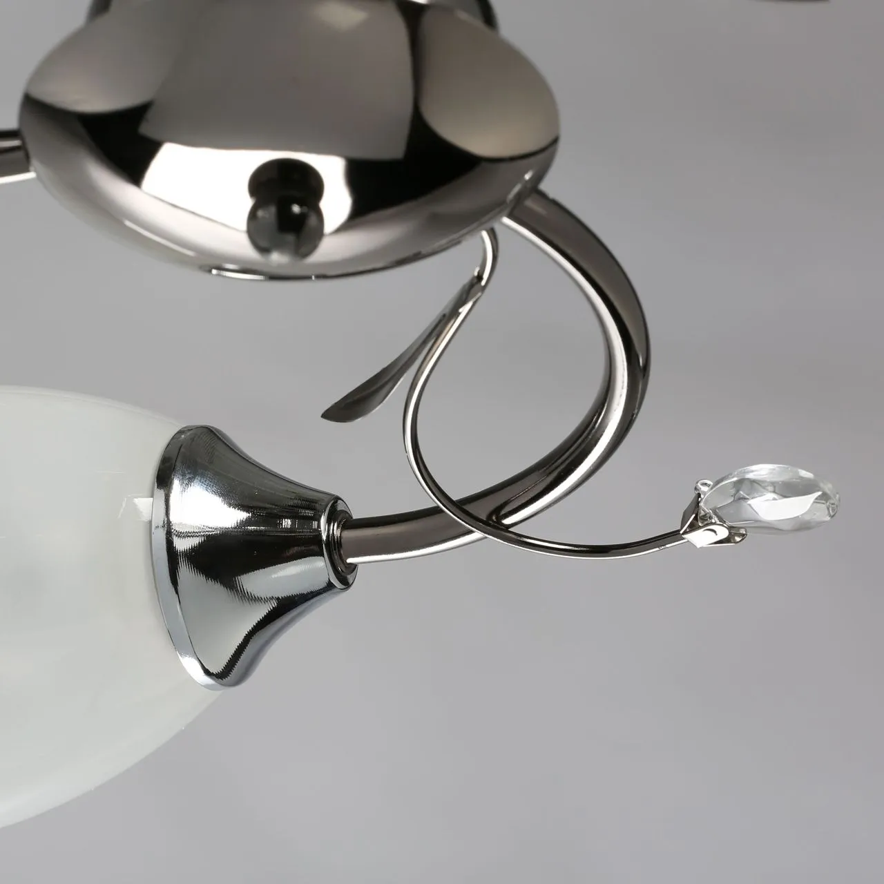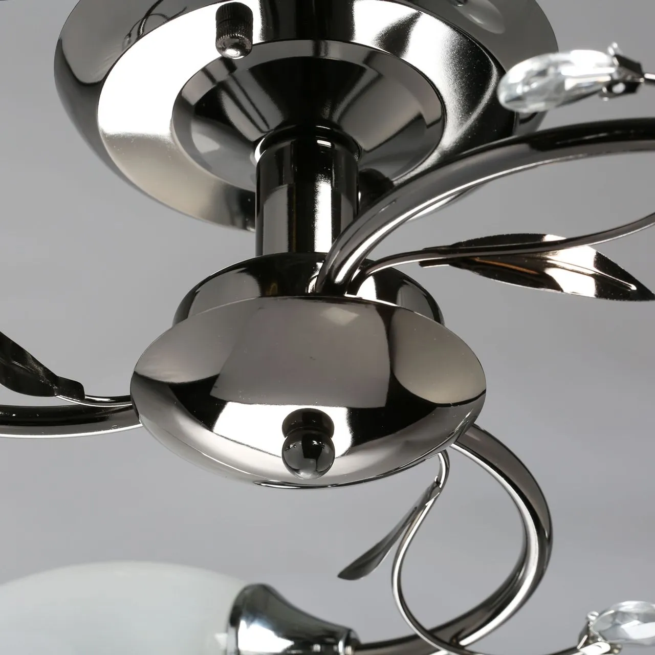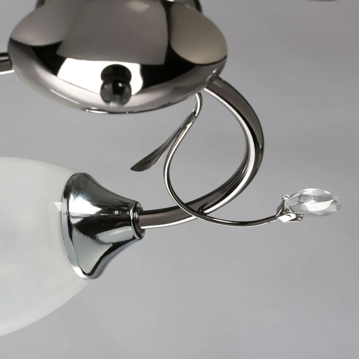 Металлическое основание цвета никеля, плафоны из матового стекла. Декор из декоративного стекла.