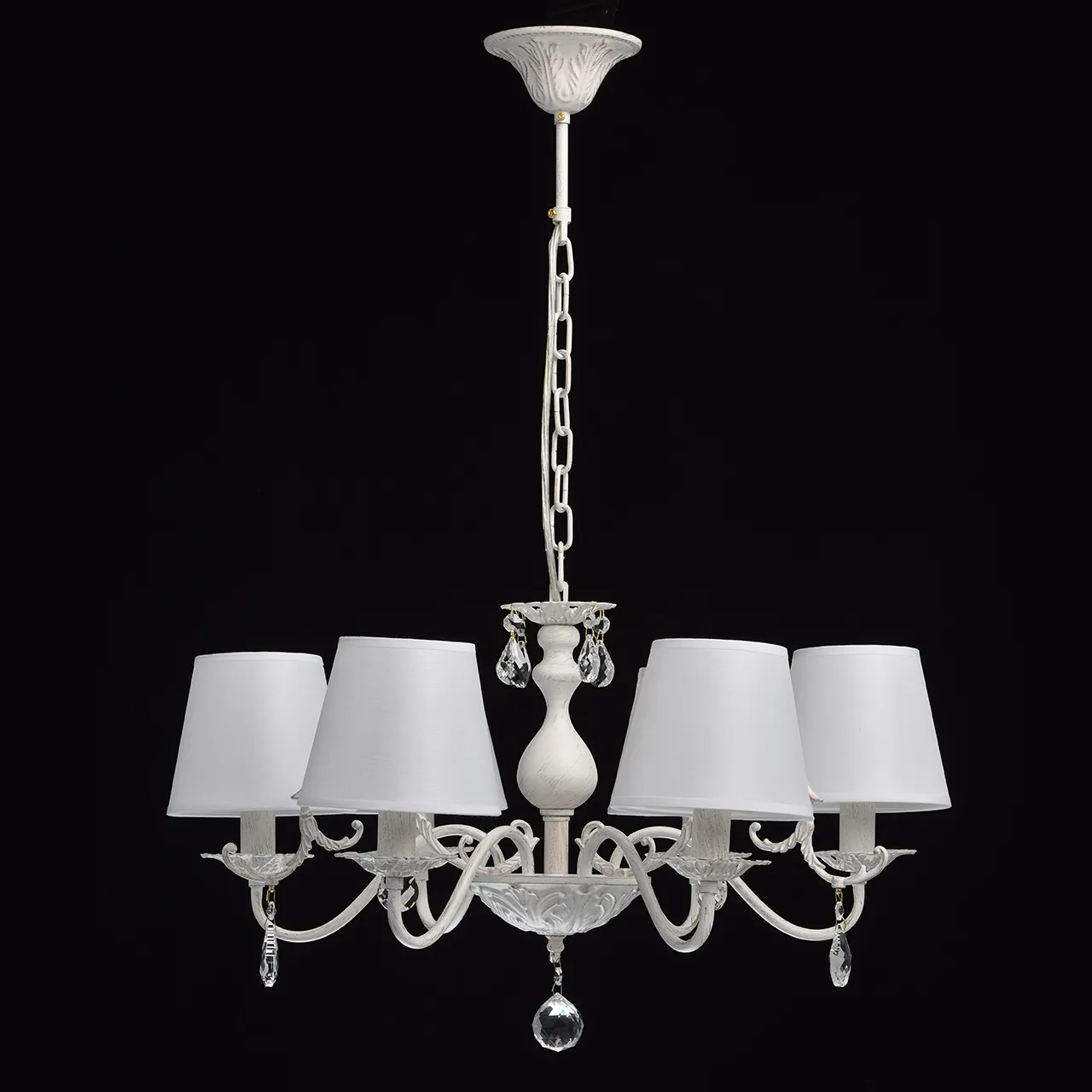 Металлическое основание окрашено в белый цвет с золотистой патиной. Абажуры - текстиль белого цвета.