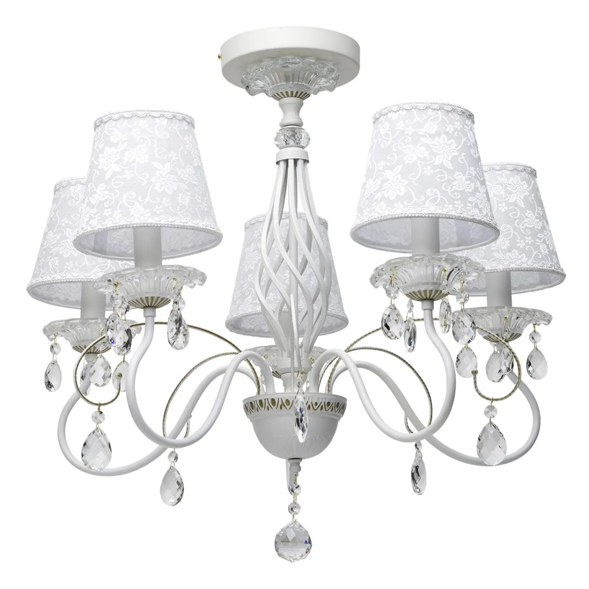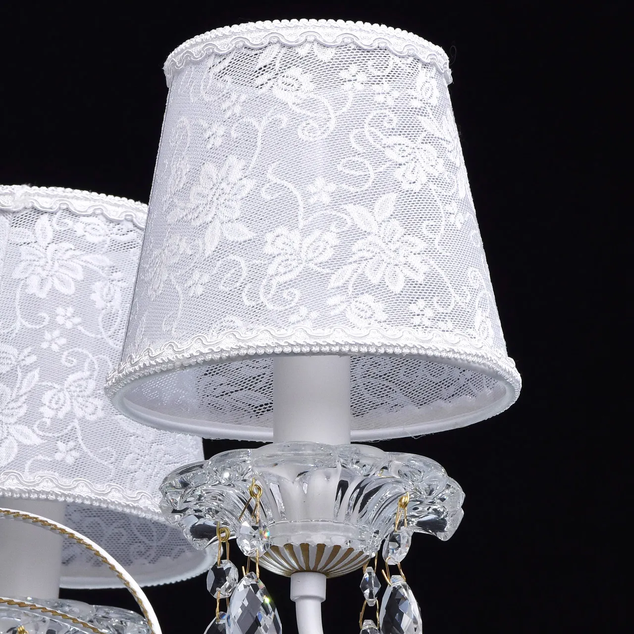 Металлическое основание белого цвета с золотистой патиной. Абажуры: из кружева. Декор: массив хрус