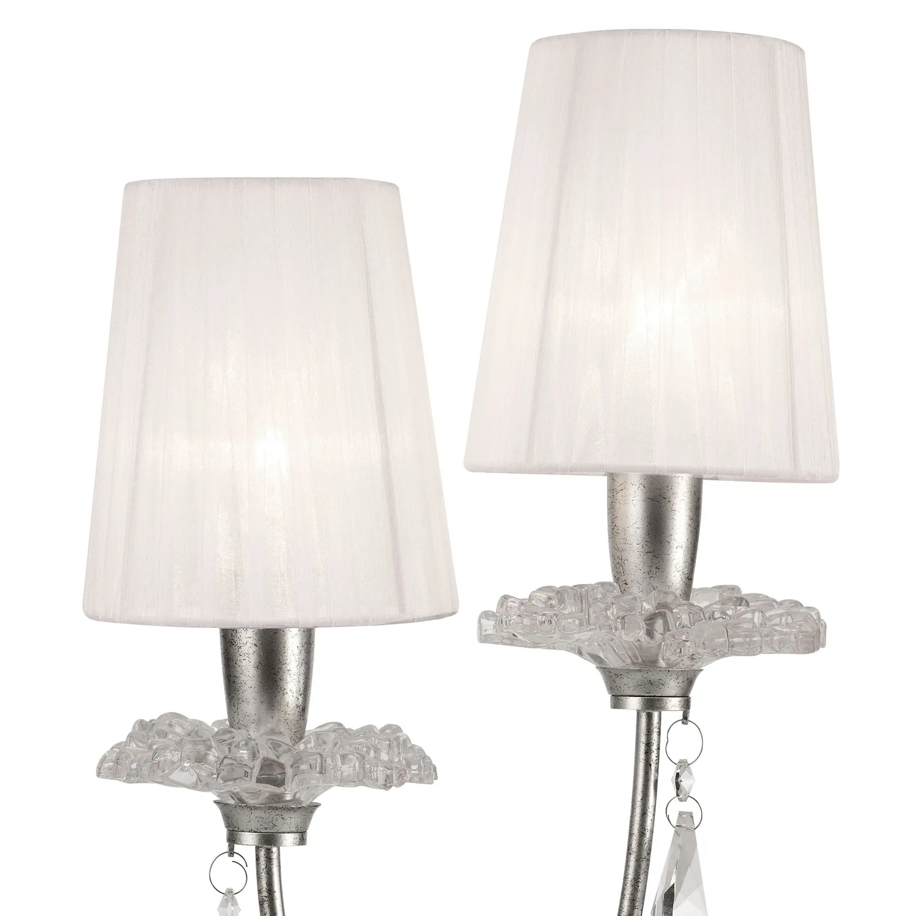 замысловатого кристаллизованного стекла и хрустальных капель, янтарных оттенков на золотых рамах и прозрачных на серебре. Небольшие интегрированные текстильные элементы разработаны так, чтобы наилучшим образом соответствовать цветовой отделке светильников. Современные оттенки белой органзы включены в каждый серебристый светильник, в то время как золотая отделка сочетается с более традиционным плиссированным кремовым шелком. Свет от ламп E14 фильтруется через абажуры спокойным и изящным способом, потрясающе преломляясь в хрустальных каплях. Дизайн